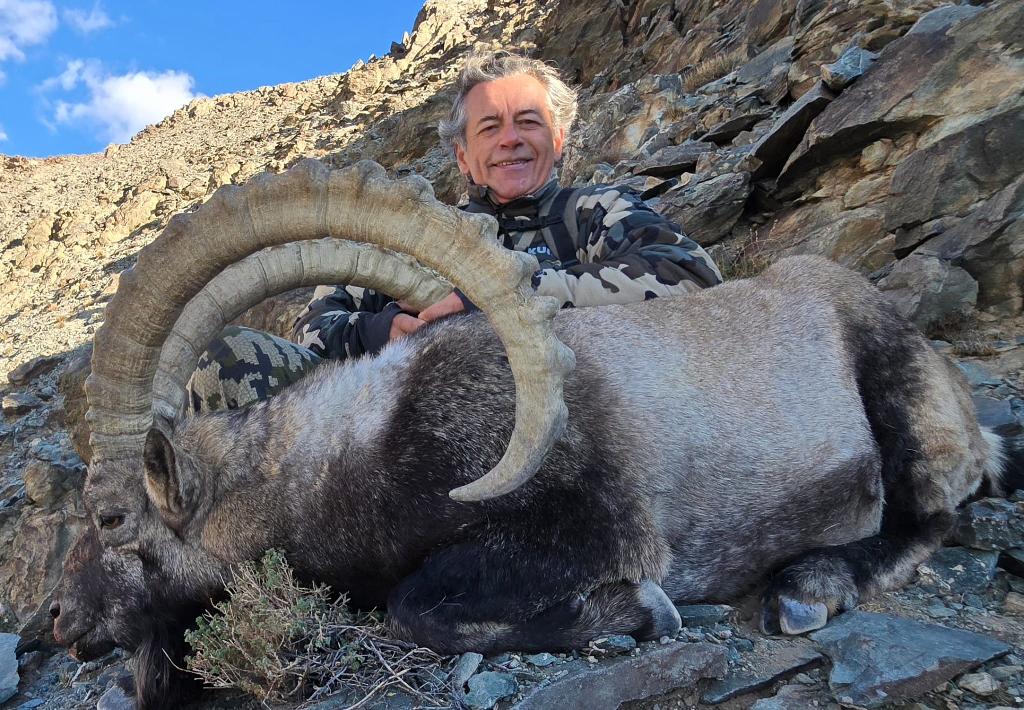 I looked for a good support, waited about 10 minutes for it to be in an ideal and clean position to shoot it and pulled the trigger. I fired with the Blaser K95 257 Wby single shot at 360 m, 330 m offset. It barely felt the shot and remained motionless, just in case I repeated it and its reaction was identical. It took both shots in the centre of its body and remained curled up for a few eternal seconds. Finally it took a few steps to its right to get into a bush and after a couple of minutes it fell about 50 m in free fall bouncing off the wall. Great joy because we knew it was going to be a great trophy.