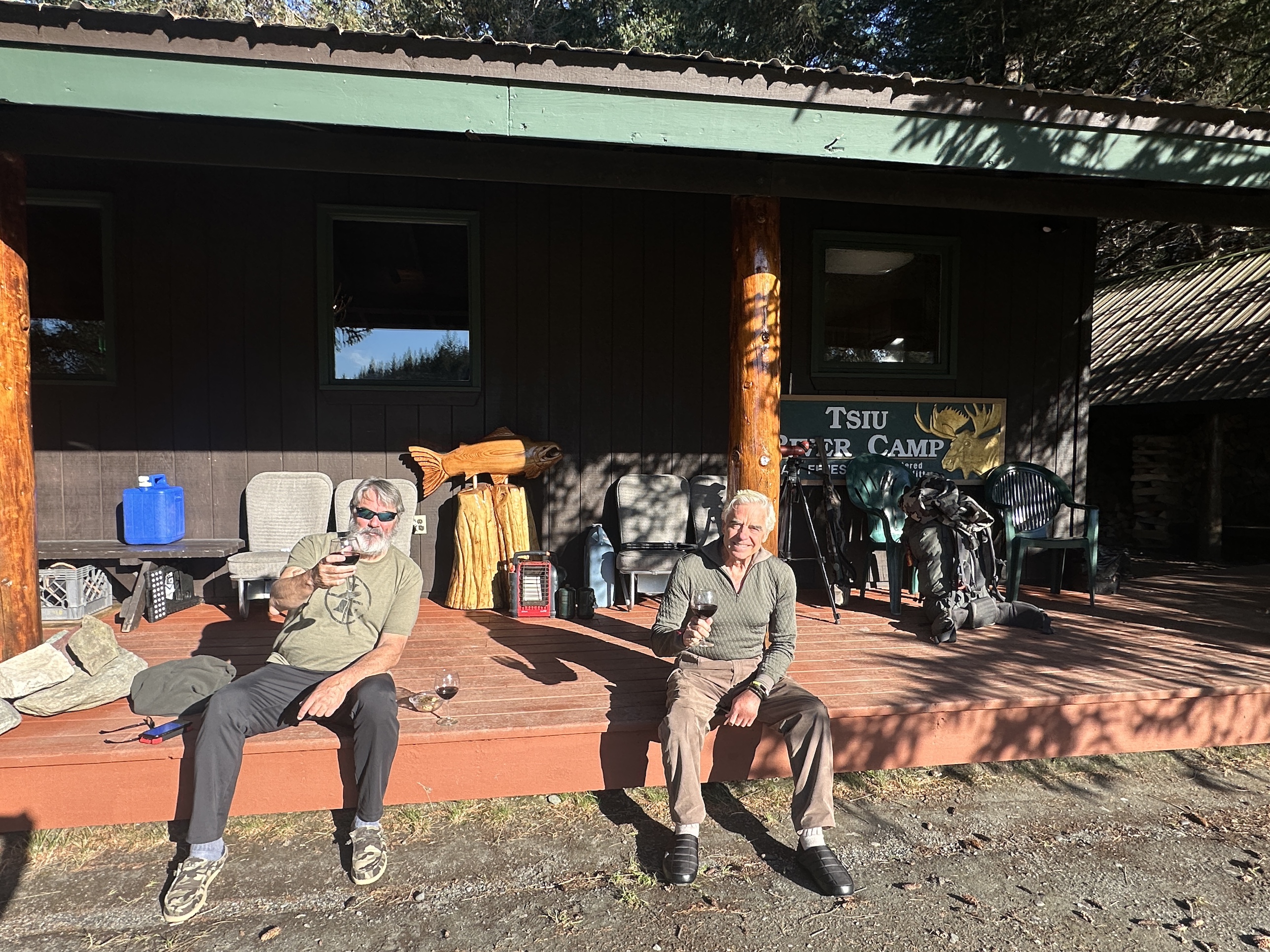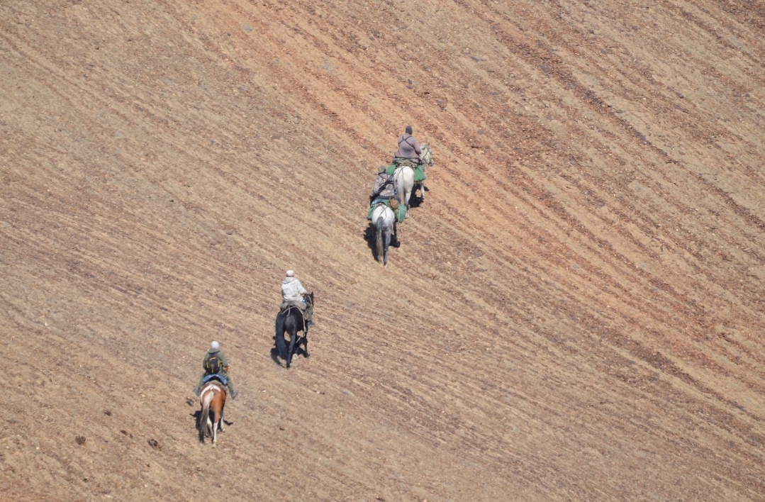Parada para comer con la carne y el trofeo del ibex ya cargado en los caballos
